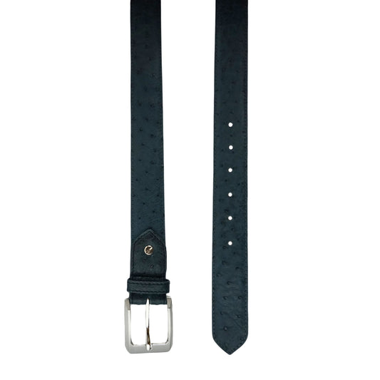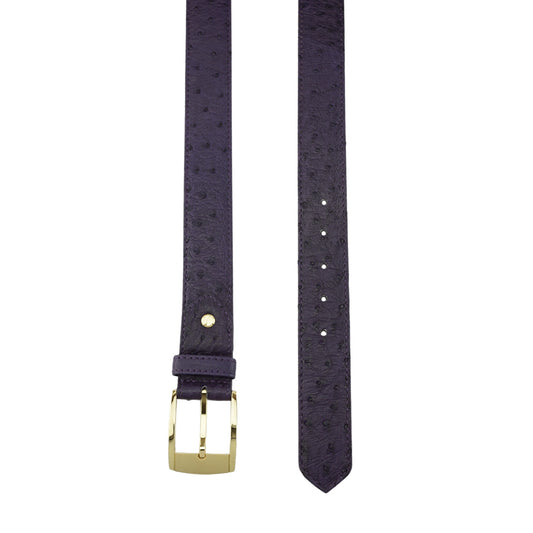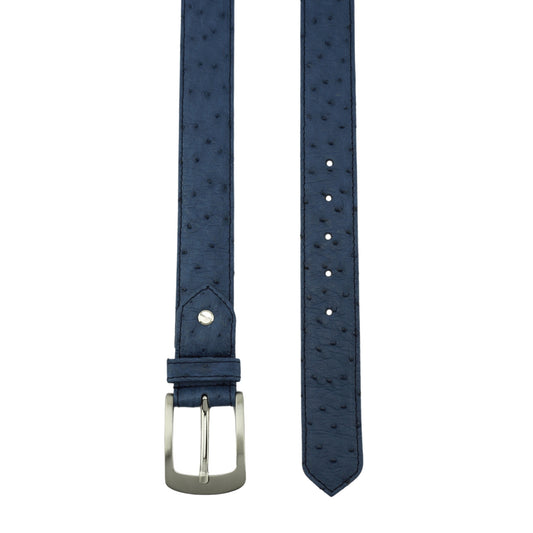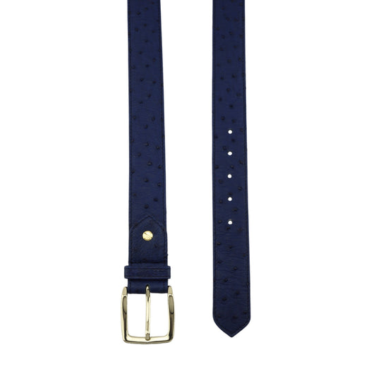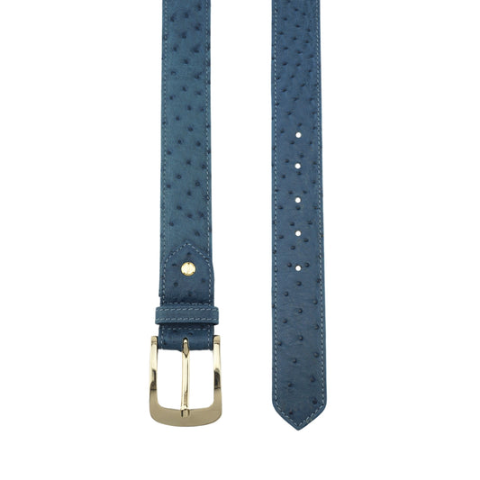 Ostrich leather belt in mod blue with gold buckle, custom made