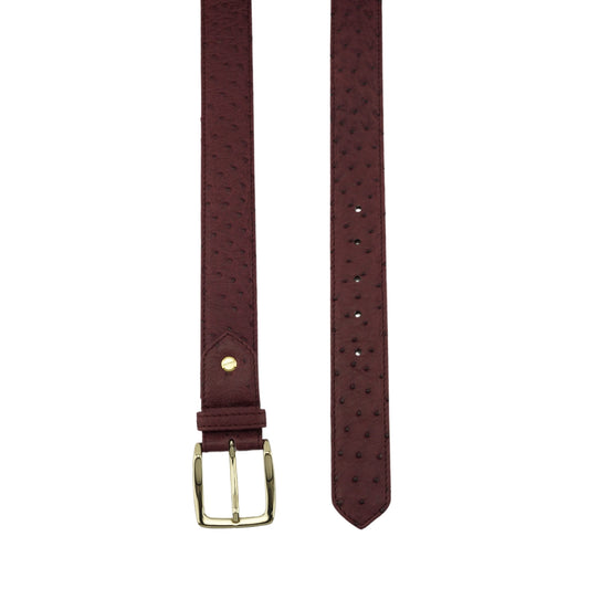 Bordeaux red ostrich leather belt with gold buckle, custom made